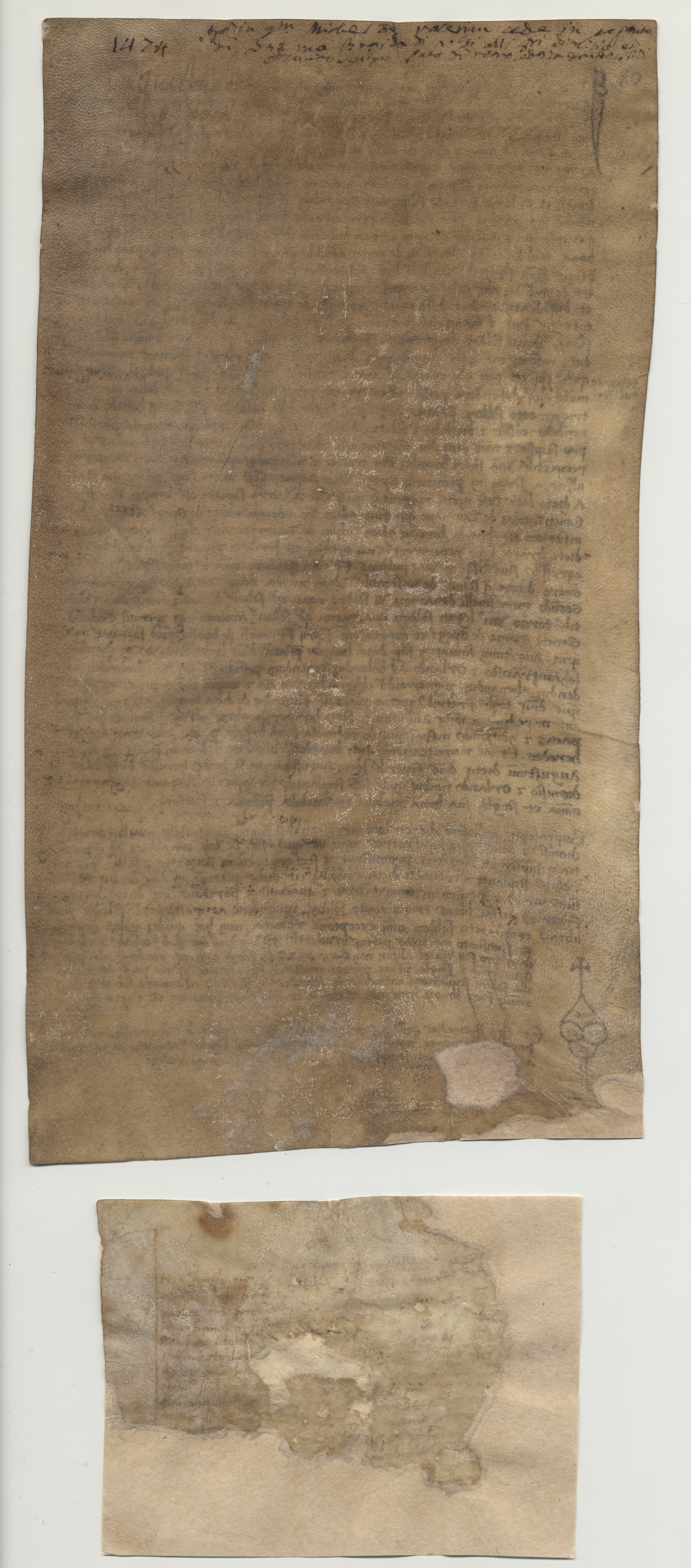 Stato conservazione e restauroPergamena in cattivo stato di conservazione; presenta alcune macchie, una lacerazione e un foro nella parte inferiore. In corrispondenza del foro, sul verso, trovasi incollato un frammento di altra pergamena datata 8 marzo 1438