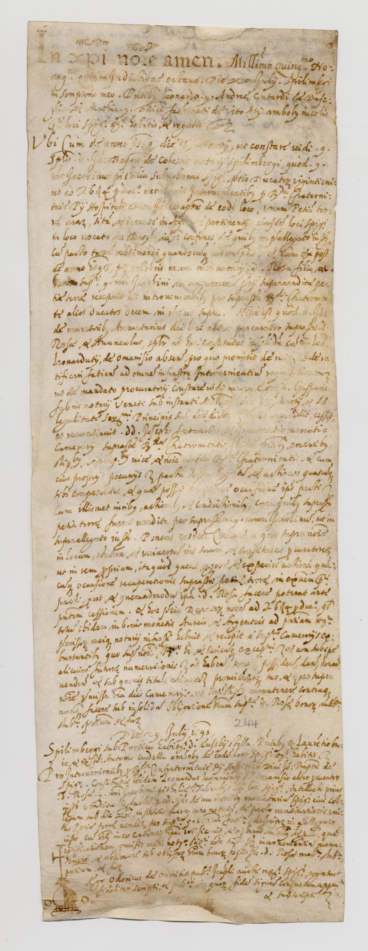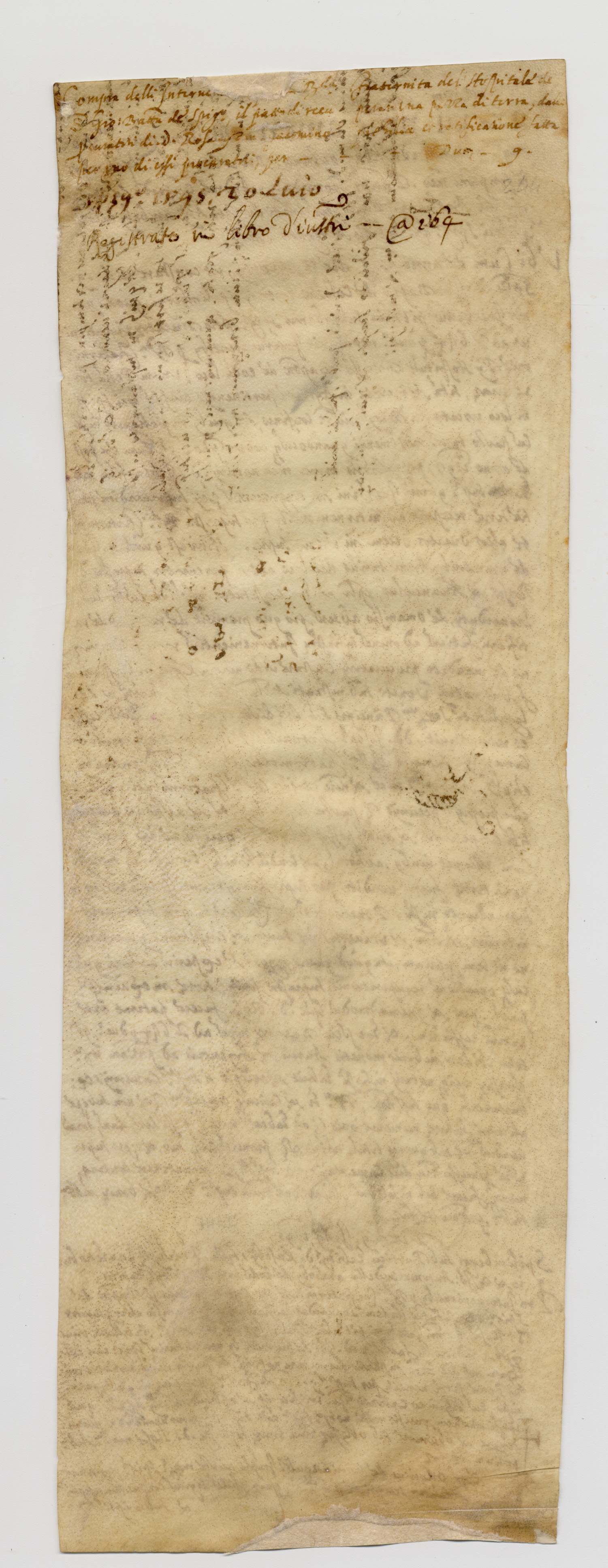 RegestoPoiché il 3 marzo 1559 Giacomino Pithilia del suburburbio di Spilimbergo aveva venduto per ventuno ducati alla fraterna dell’ospedale di S. Giovanni Battista un terreno sito nelle pertinenze di Spilimbergo, in località Broylo, e siccome il 1 ottobre 1593 sua figlia Rosa aveva ricevuto dalla fraterna la somma di dieci ducati ad integrazione del prezzo pattuito, ora la stessa Rosa mediante i suoi procuratori cede e rinuncia ai nuovi camerari Giuseppe Fontanellis e Innocenzo Marcuzzi tutti i suoi diritti e azioni su tale terreno. Il successivo 29 luglio segue ratifica da parte di un altro procuratore della donna.