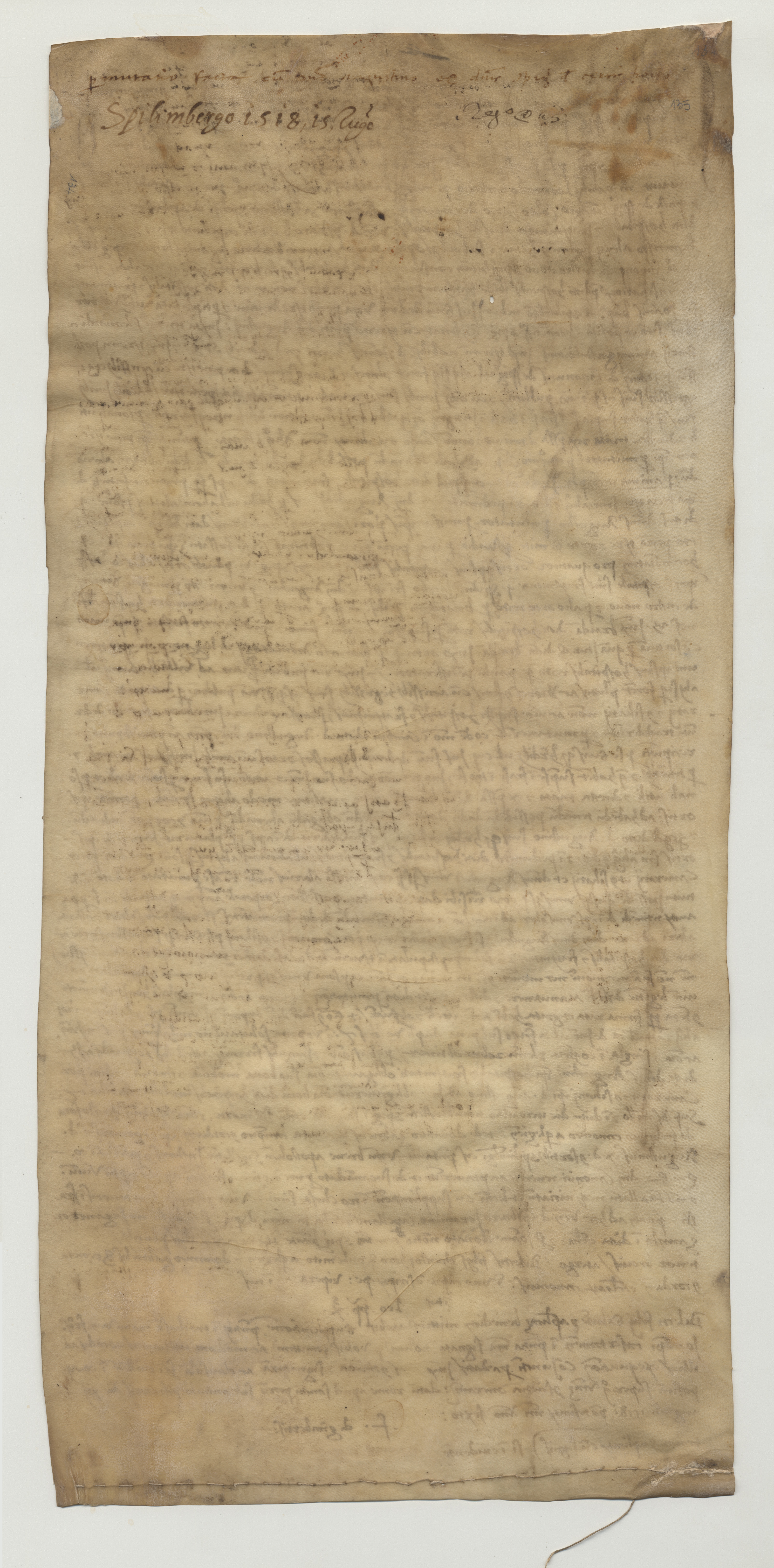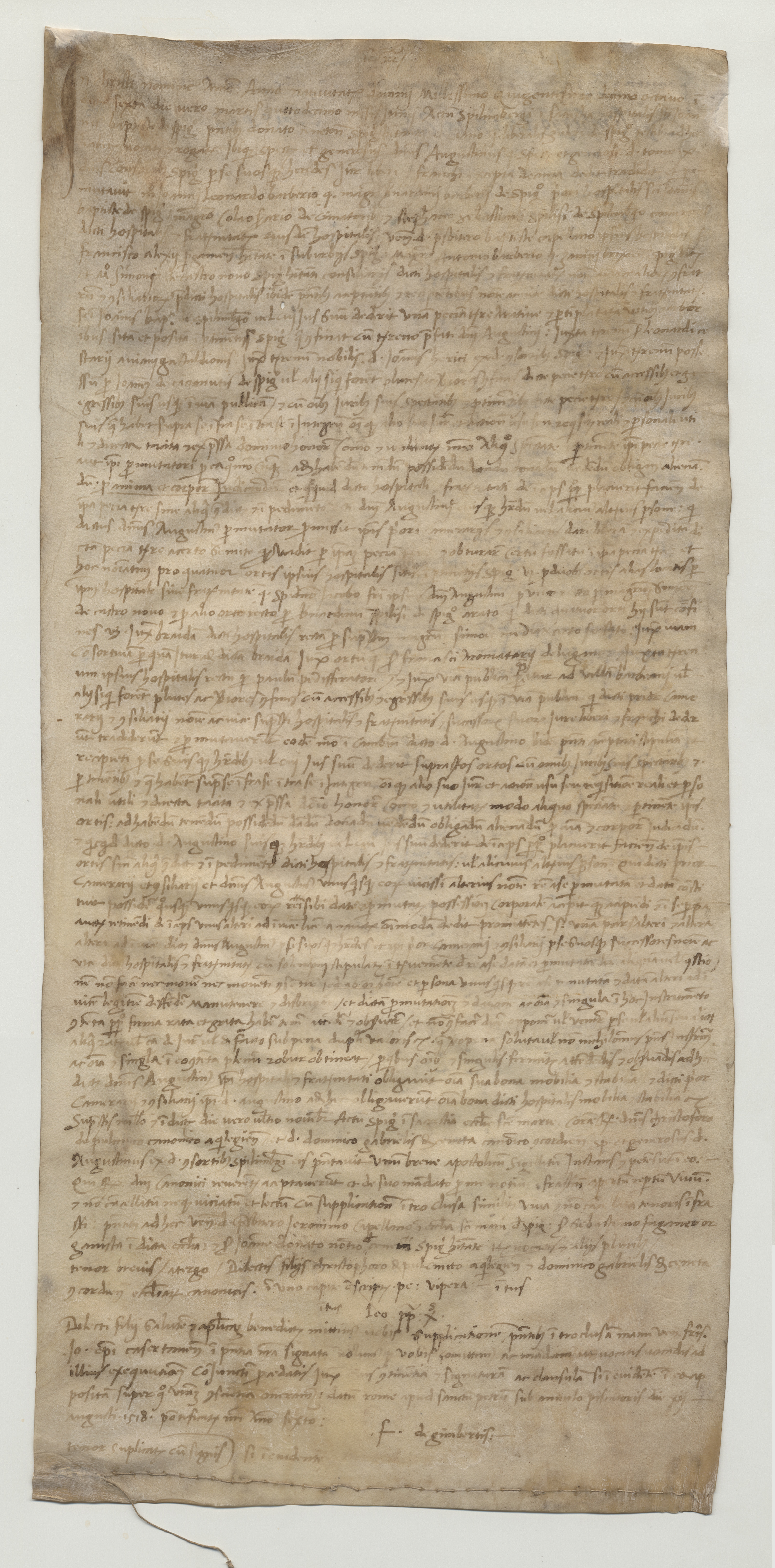 RegestoIl nobile Agostino del fu Tommaso dei consorti di Spilimbergo cede in permuta a Giovanni Leonardo barbiere del fu Bernardino barbiere, priore dell’ospedale di S. Giovanni Battista, a Colò serario de Cimatoribus e a Stefano di Sebastiano Spilisii da Spilimbergo, camerari dell’ospedale, e a prete Battista cappellano dello stesso ospedale, un pezzo di terra arata e in parte piantata con viti e alberi, sita nelle pertinenze di Spilimbergo, ricevendone in cambio quattro orti di proprietà dell’ospedale, siti in quelle stesse pertinenze, due dei quali erano stati affittati al defunto nobile Giacomo, fratello di Agostino. Il successivo 30 novembre, nella sacristia di S. Maria di Spilimbergo, il nobile Agostino presenta al notaio un breve scritto sigillato, contenente una lettera del vescovo di Caserta datata Roma, 18 agosto 1518. Infine, il primo dicembre 1518 avviene la ratifica della permuta; i pezzi di terra ricevuti in permuta dal nobile Agostino, già appartenuti all’ospedale di S. Giovanni Battista e alla chiesa di S. Croce di Baseglia, sono posti in località Tavella e in località Prope et extra Castrum Spilimbergi.