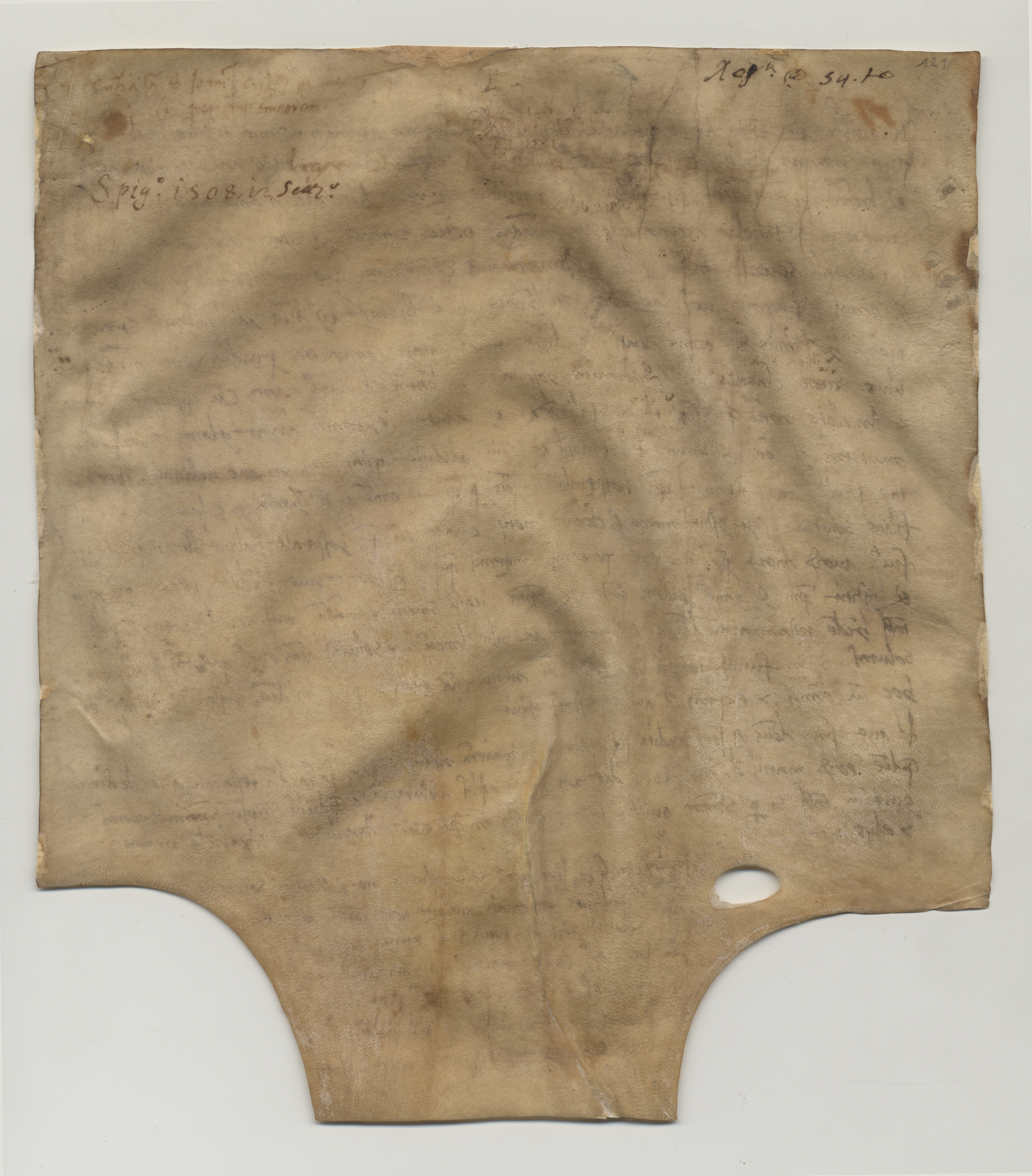Stato conservazione e restauroPergamena in cattivo stato di conservazione, con macchie e inchiostro evanito in alcuni punti