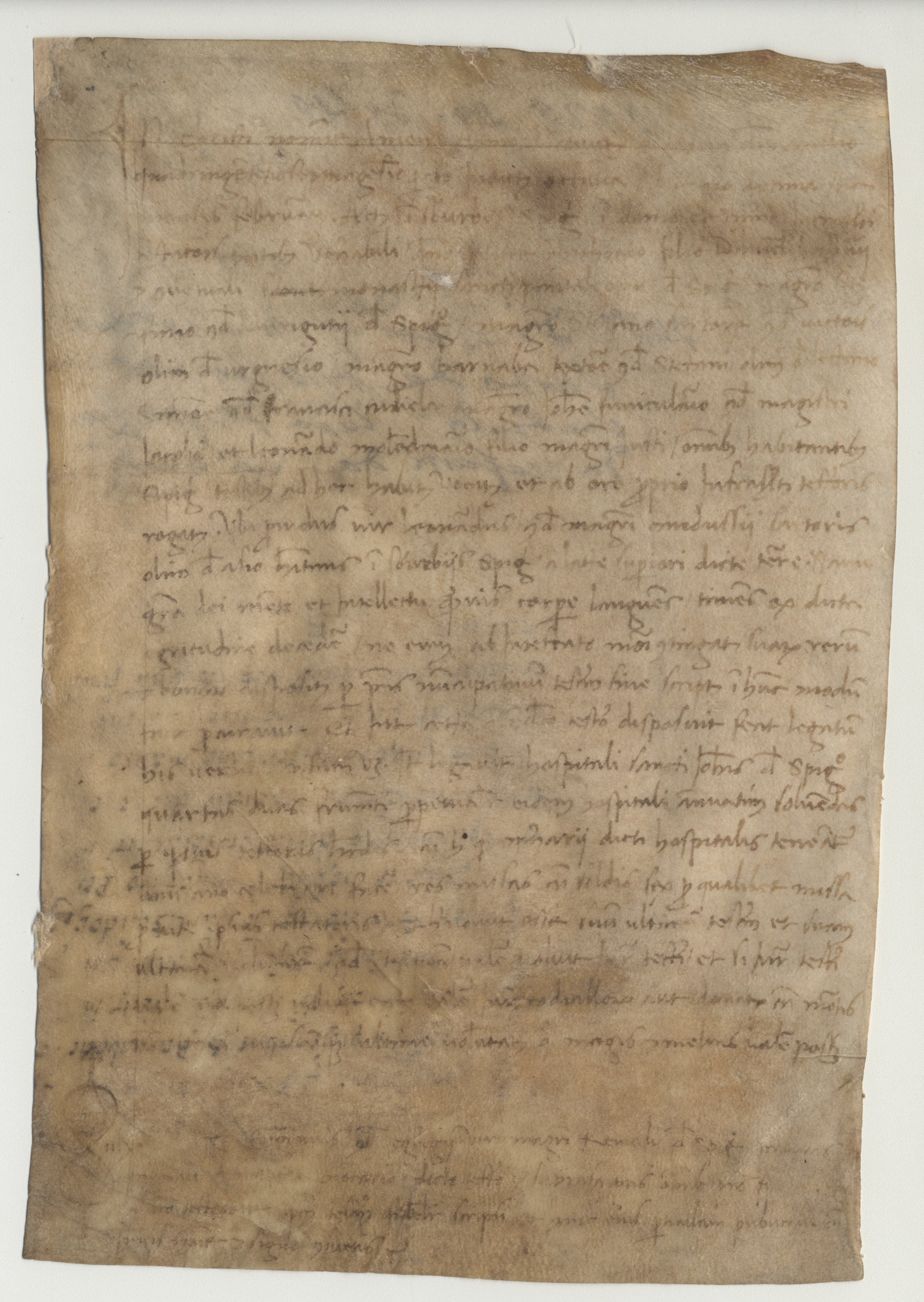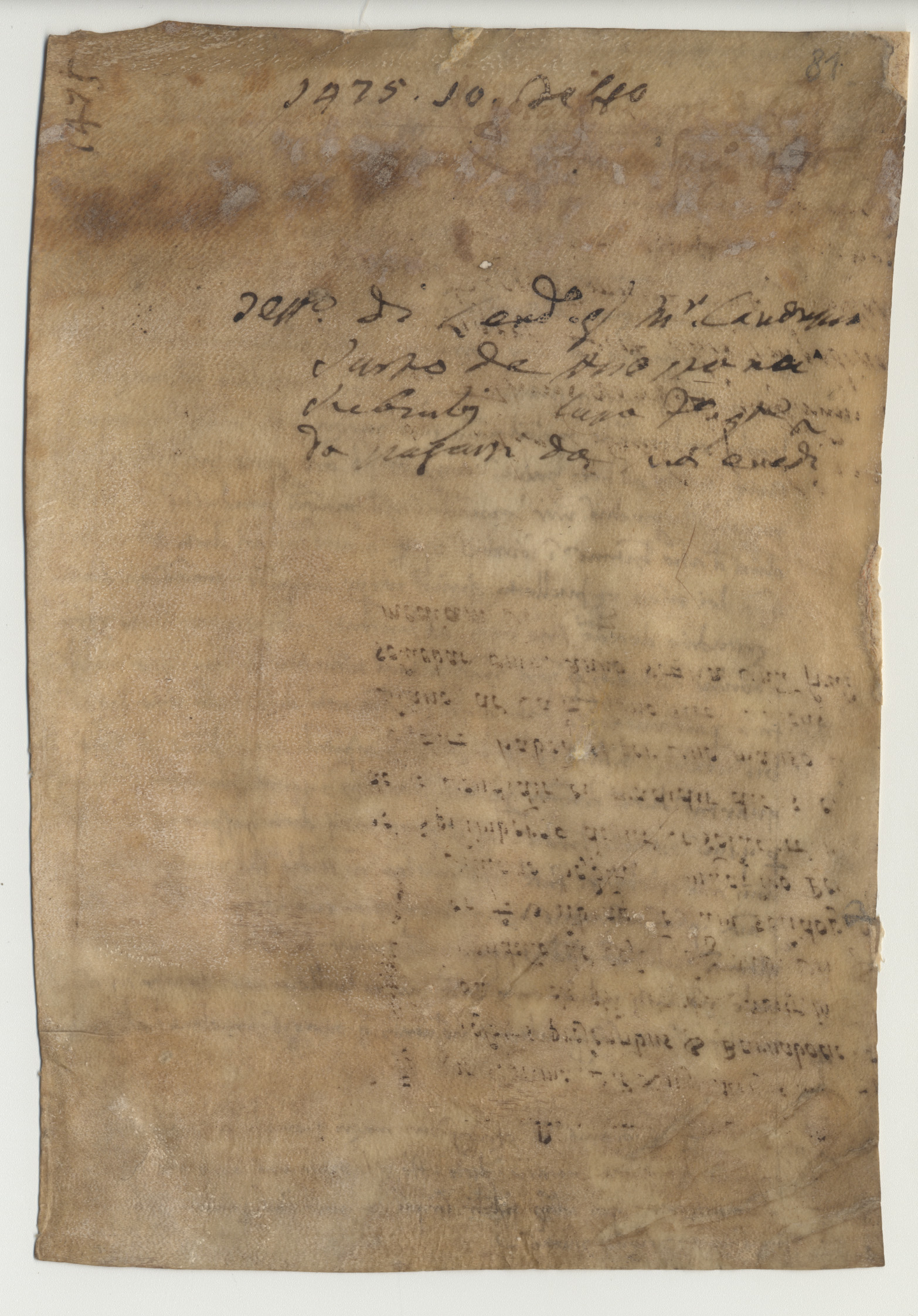 Stato conservazione e restauroPergamena in cattivo stato di conservazione; presenta macchie, grinze e inchiostro evanito, specialmente nella parte inferiore.