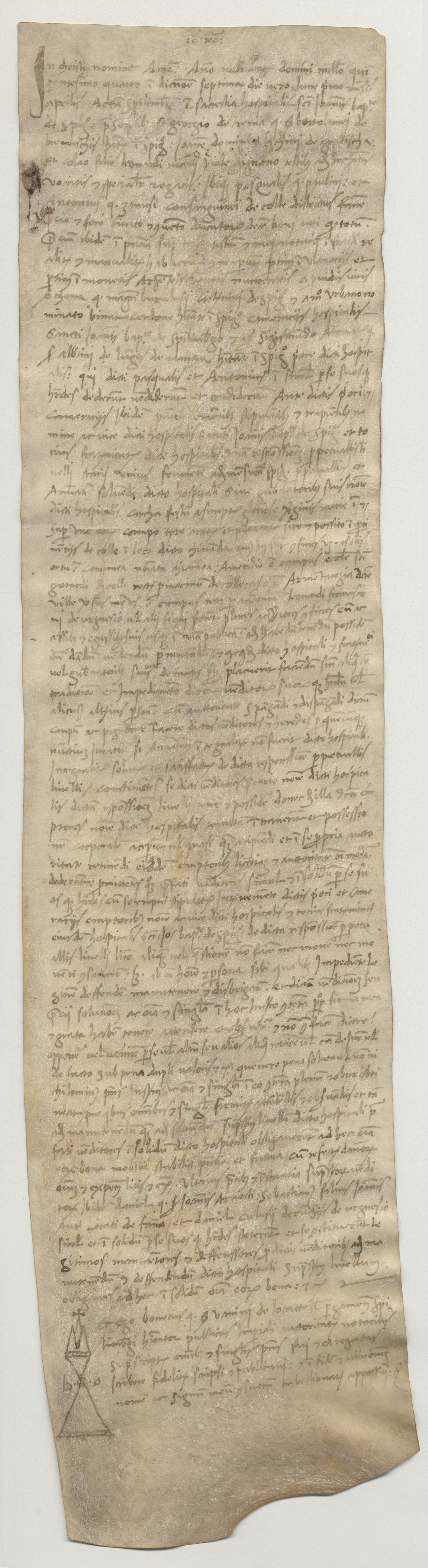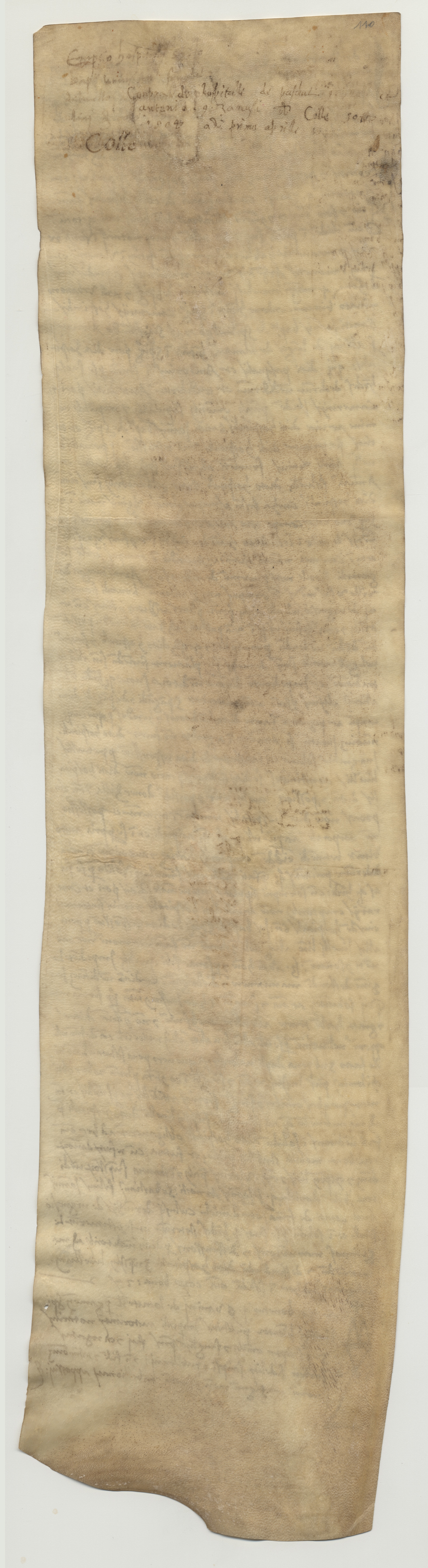 RegestoPasquale del fu Paolino e Antonio del fu Zanussio da Colle nel distretto di Fanna, consanguinei, vendono per dieci ducati a Tommaso del fu Bortolussio Cisternini e Antonio Urbano detto “Binut” calzolaio abitante a Spilimbergo, camerari dell’ospedale di S. Giovanni Battista di Spilimbergo, e al priore ser Sigismondo aromatario del fu ser Albertino de Lungis da Mantova abitante a Spilimbergo, la corresponsione di un livello di uno staio di frumento, da pagarsi ogni anno nella festa dell’Assunta, su un loro campo di terra arata e piantata nelle pertinenze di Colle, in località Chiaranda.