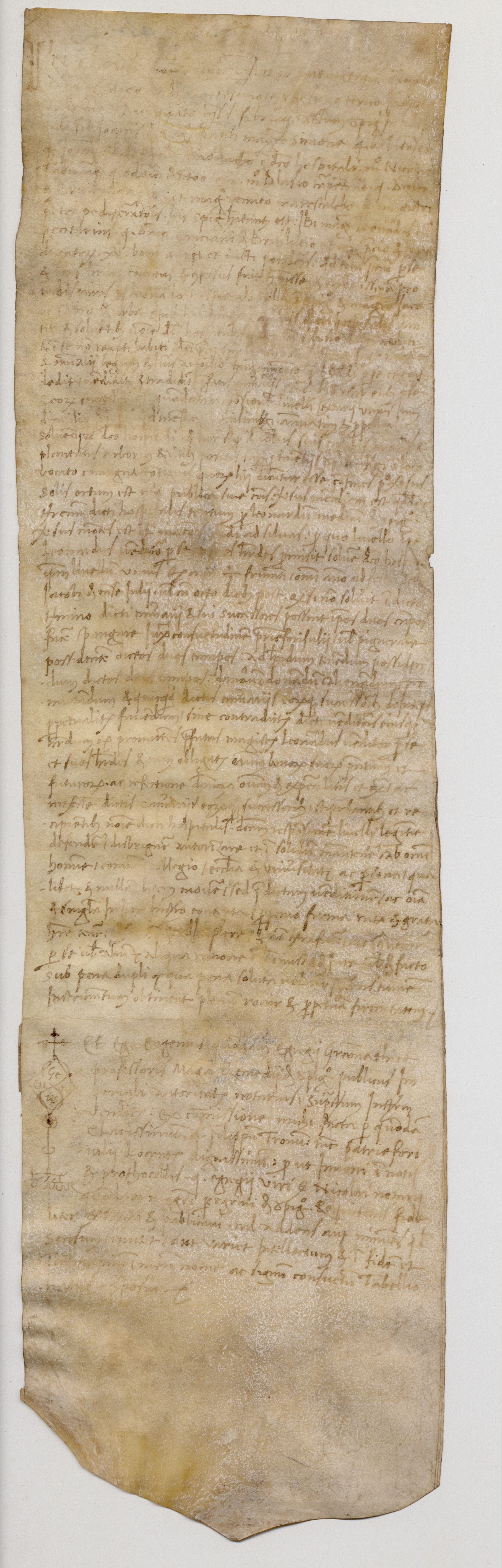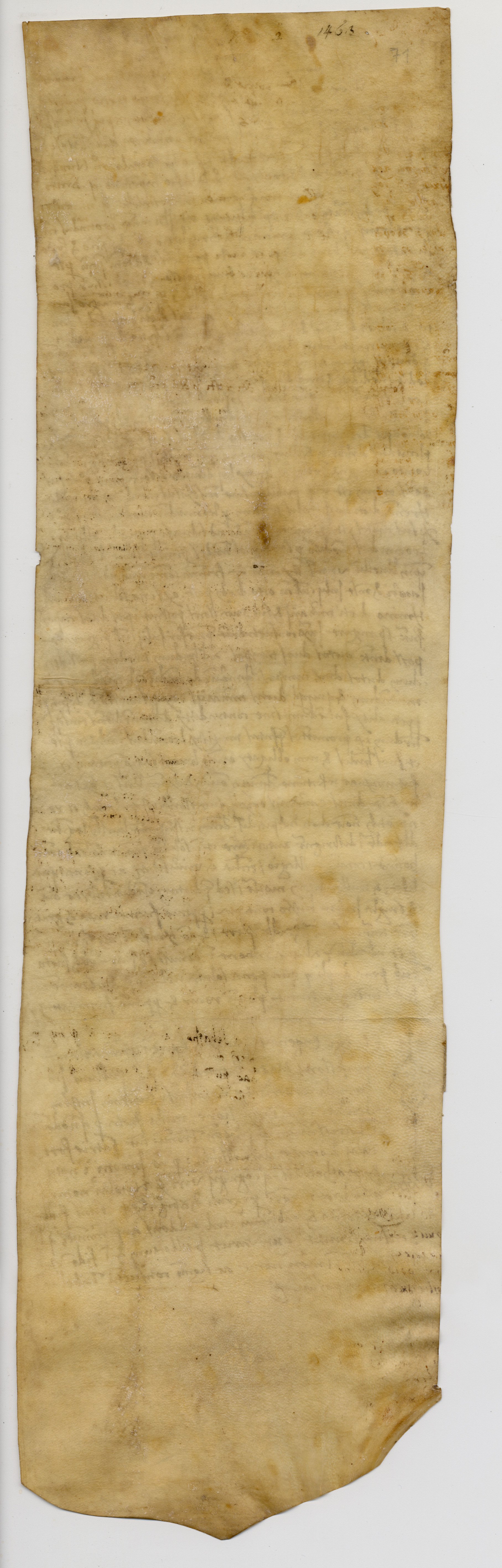 Stato conservazione e restauroPergamena in cattivo stato di conservazione; presenta macchie e inchiostro evanito in vari punti